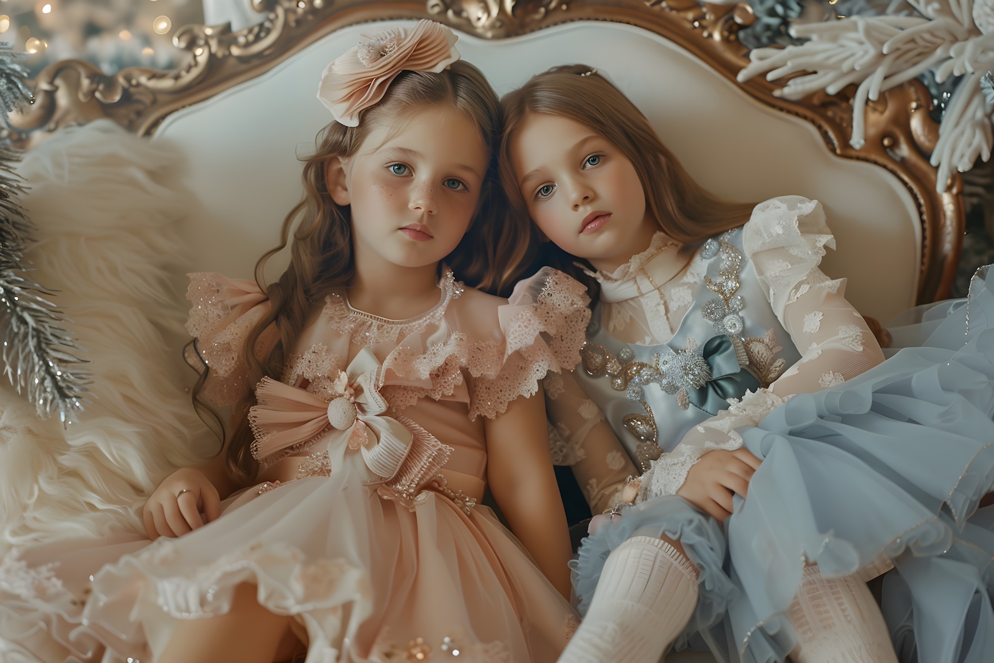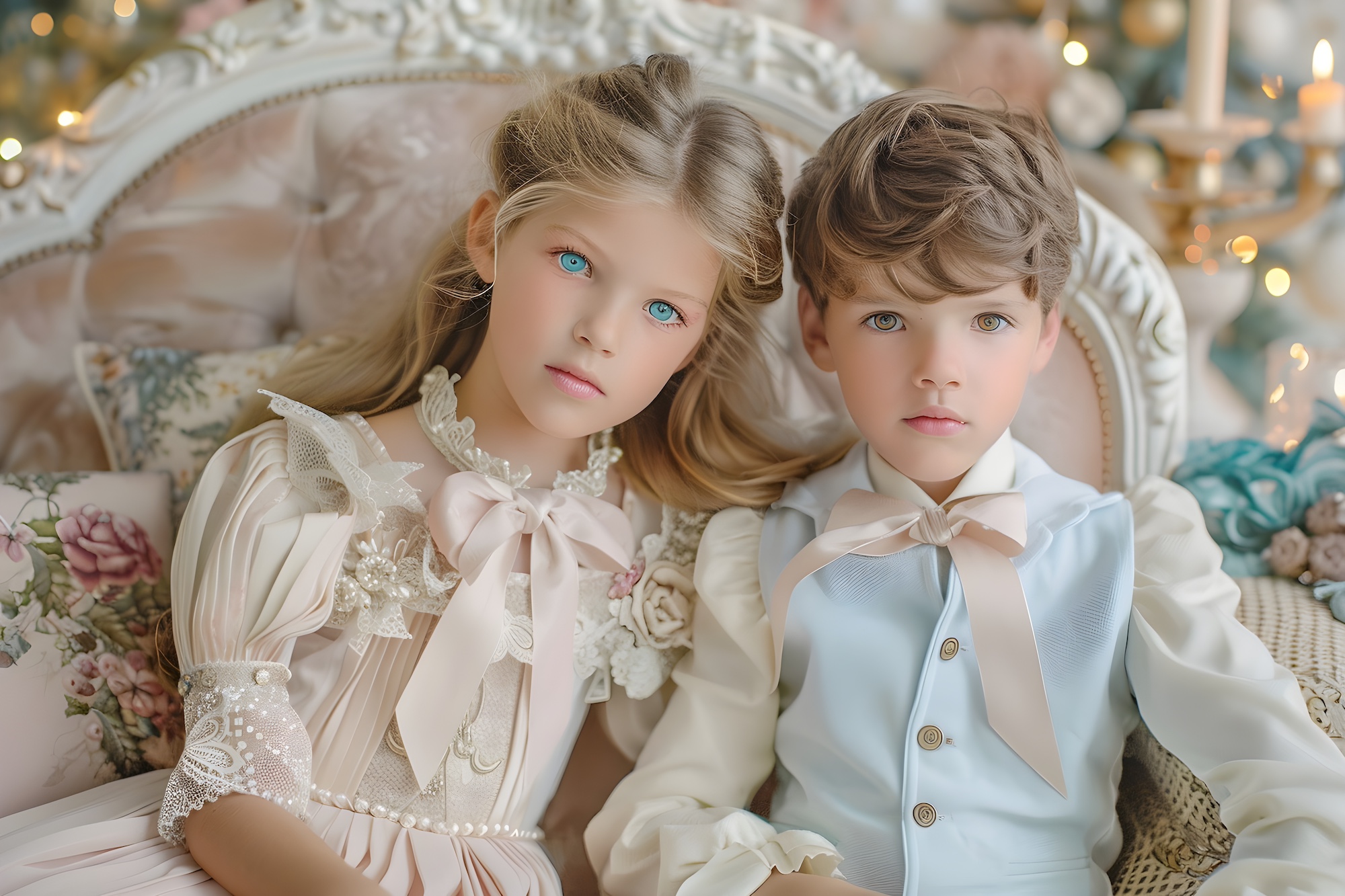 A Grandmillennial Christmas for kids with a Regency glamour mood comes to life most beautifully through dresses that feel romantic, soft, and intentionally detailed. For girls, this means pastel Christmas outfits that balance structure with delicacy. Empire waist silhouettes in blush pink, powder blue, and antique ivory evoke Regency inspired Christmas fashion for kids while remaining comfortable and child friendly. Puff sleeves, gentle gathers, and flowing skirts create movement and elegance, allowing the outfit to feel celebratory without being restrictive. Satin ribbon sashes tied into bows, velvet hair ribbons, and subtle lace trim elevate these looks into the realm of luxury kids Christmas fashion, making each piece feel worthy of a holiday portrait or heirloom memory.
