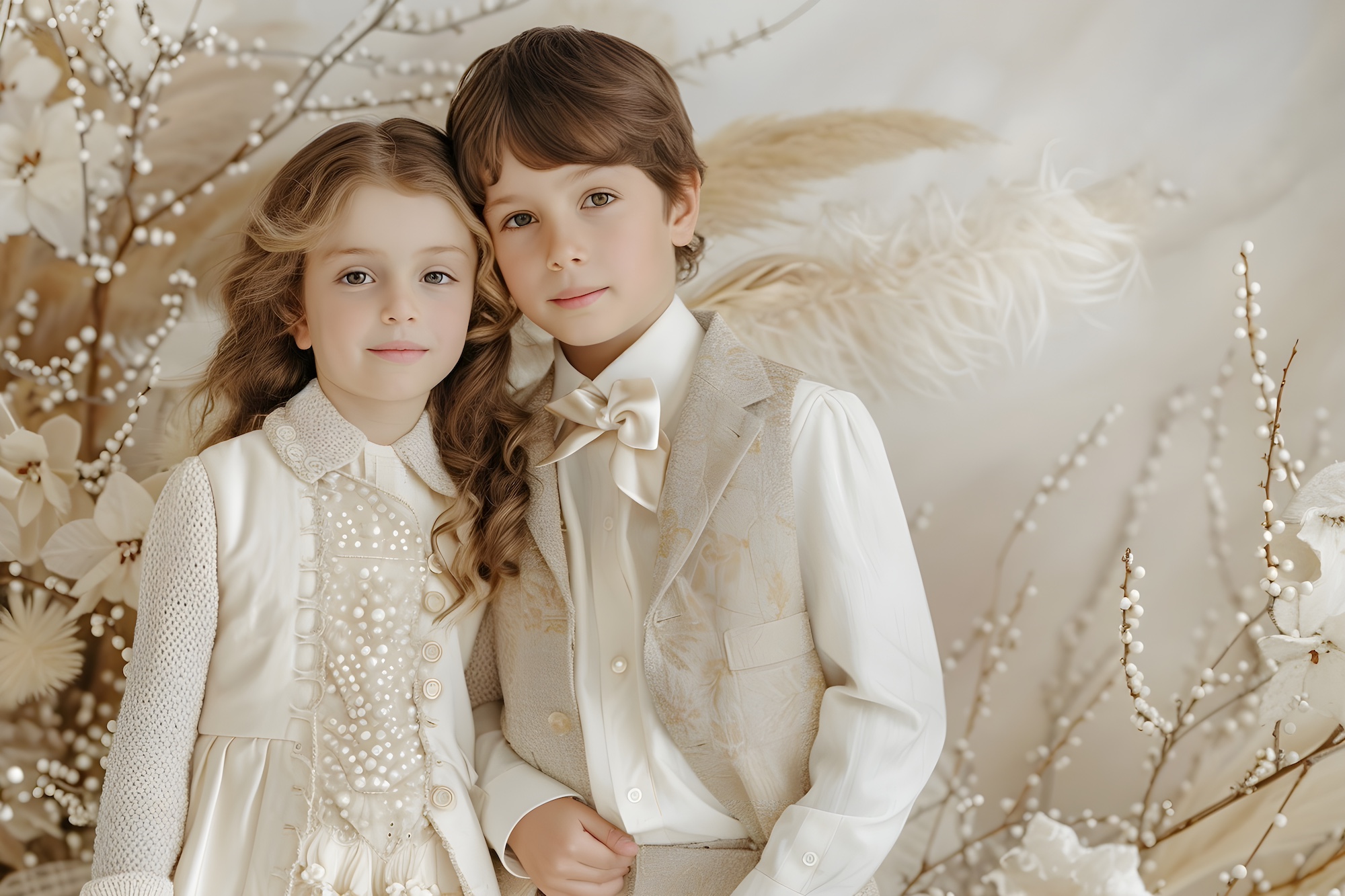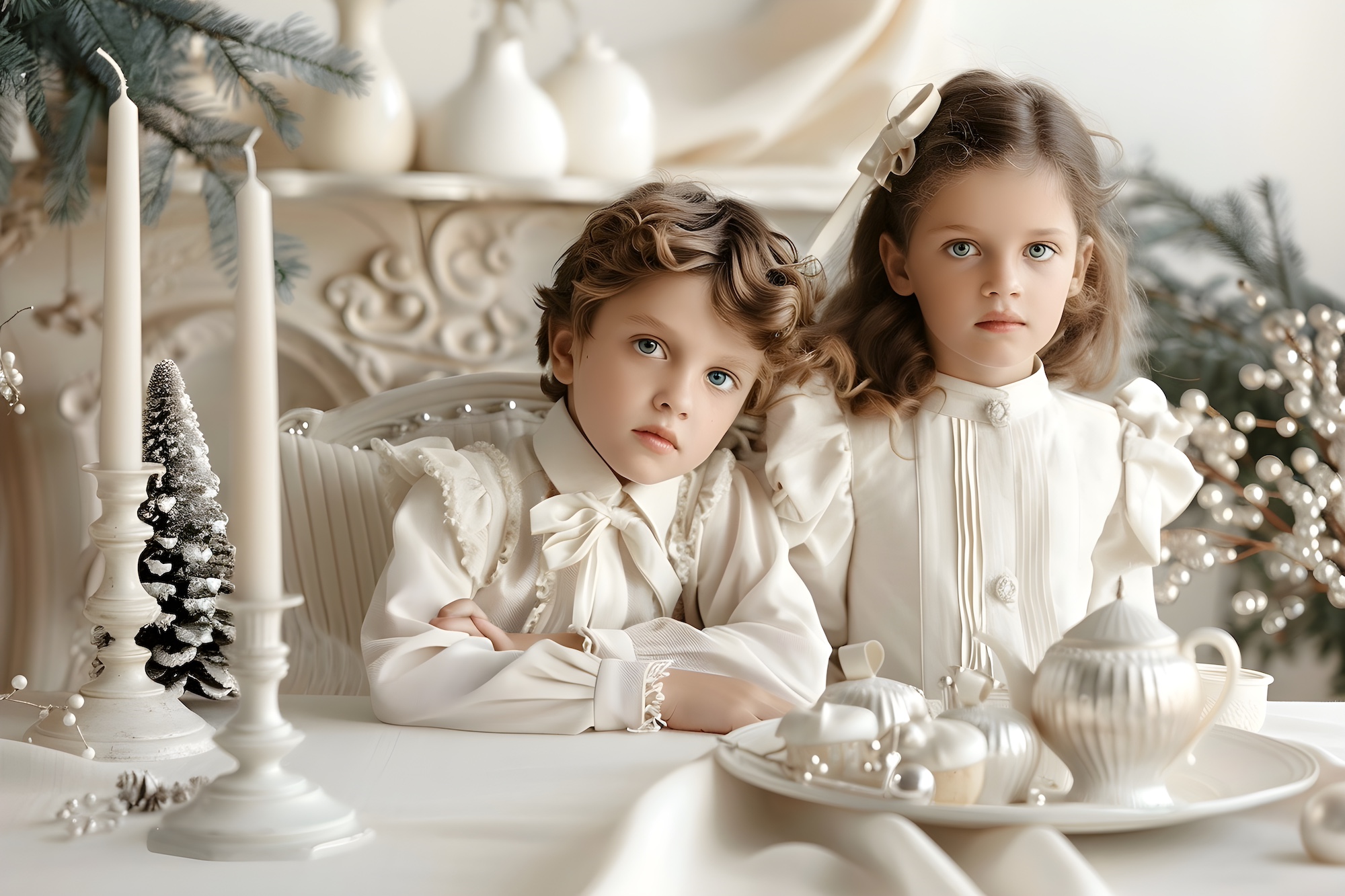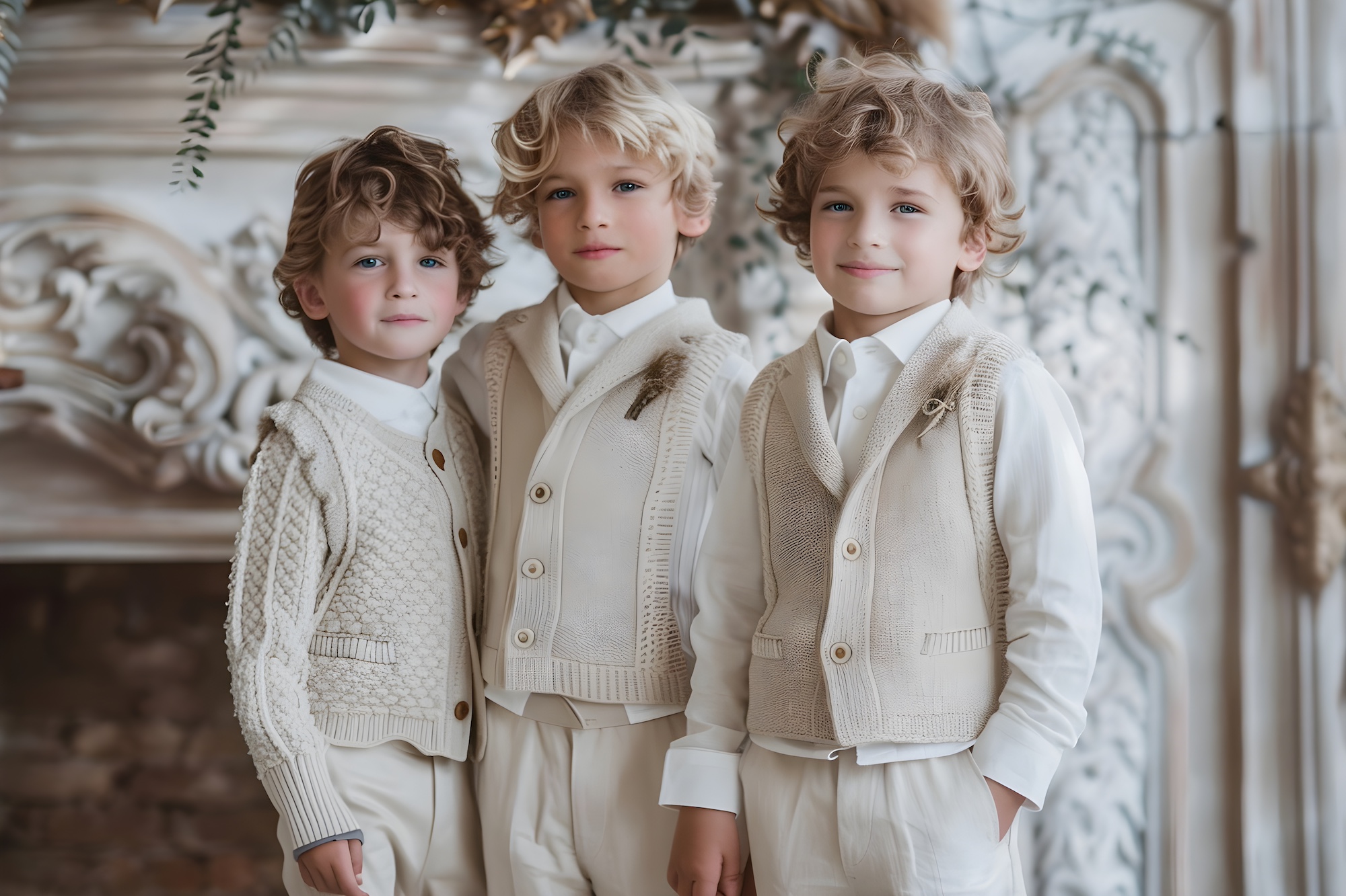 Grandmillennial Christmas style for kids is equally compelling for boys when heritage tailoring and refined textures take the lead. Cream trousers paired with velvet waistcoats in dusty rose, pale sage, or deep champagne create a polished foundation that feels timeless and festive. A softly pleated white shirt underneath adds a subtle Regency influence, grounding the look in Regency glamour Christmas for children without feeling formal or stiff. These outfits embody luxury kids Christmas fashion through thoughtful proportions and classic construction, making them ideal for holiday gatherings, church services, or family portraits.